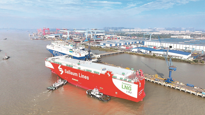 11月6日,由招商局金陵船舶有限公司为瑞士航运巨头Sallaum Lines定制的7400车位LNG双燃料汽车滚装船(PCTC)在仪征基地顺利出坞,标志着该系列高端环保船舶建造迈入关键阶段,“扬州制造”再添全球航运领域新成果。 郭玉峰 赵明 摄 (视觉江苏网供图)