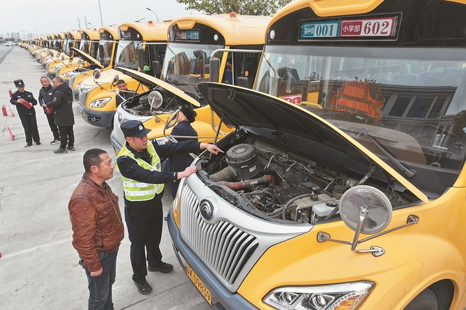 12月2日是全国交通安全日,宝应县公安局交管大队联合各乡镇派出所对辖区内的校车开展专项安全检查,通过讲解如何预防交通事故、教授正确使用车载灭火器方法、检查整治车辆安全隐患等形式,向校车驾驶员宣传冬季安全防范知识,确保学生乘车安全。 沈冬兵 摄 (视觉江苏网供图)