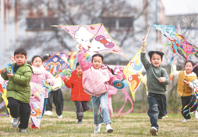 3月19日,扬州市江都区实验幼儿园组织小朋友在通扬运河河畔的草地上放风筝,迎接春分的到来。 任飞 摄 (视觉江苏网供图)