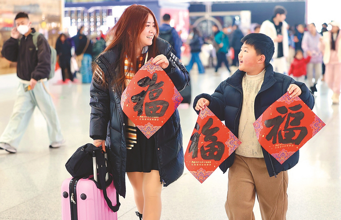 2月1日,2026“福至运来 情满旅途——江苏省千名书法家送万福进万家”活动在南京南站启幕。 本报记者 邵丹 赵亚玲 摄