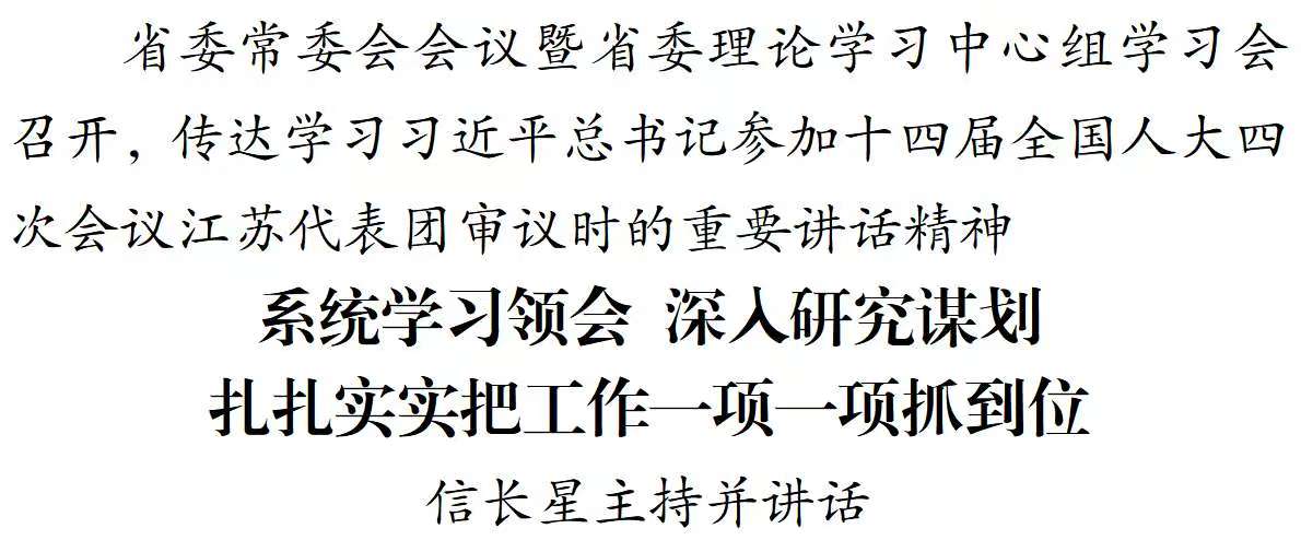 本报讯 (记者 黄伟) 3月13日,省委常委会会议暨省委理论学习中心组学习会召开,传达学习习近平总书记参加十四届全国人大四次会议江苏代表团审议时的重要讲话和近期发表的重要文章精神,研究贯彻落实举措。省委书记信长星主持会议并讲话。