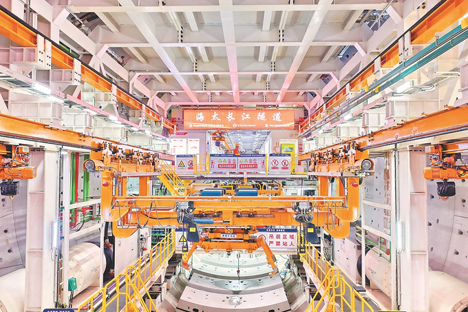 3月22日,在中铁十四局施工的世界最长公路水下隧道——海太长江隧道,“江海号”盾构机掘进达4658米,完成总掘进任务过半。该隧道位于我省长江入海口区域,北起南通海门区,南至苏州太仓市,线路全长39.07公里,过江隧道长11.185公里,隧道盾构段长9315米,工程计划2028年建成通车。 许丛军 摄 (视觉江苏网供图)